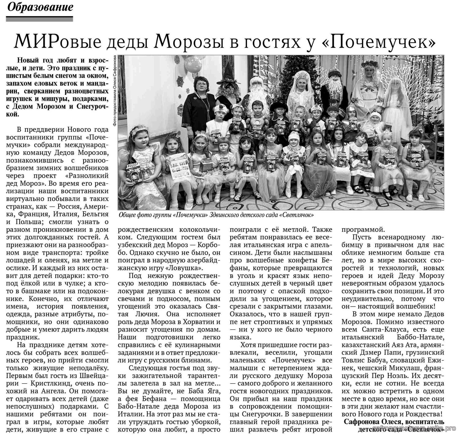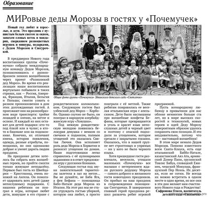 Воспитанники группы "Почемучки" познакомились и дедами Морозами нашей многонациональной страны. Узнали какие они. Новая информация повысила познавательный интерес к данной теме, а также стимулировала образность мышления детей и помогла создать мотивацию для организации творческого процесса в группе.
