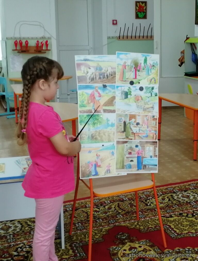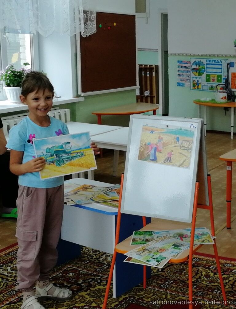 Ну что ж, выросли пшеница и рожь, пришла пора убирать урожай. В старину это делали так. Брали мужчины в руки косы, а женщины серпы и шли в поле (показ иллюстрации с изображением серпа). Им срезал колосья и собирали их в снопы. Но колосья надо было ещё обмолотить, то есть вынуть из колосьев зёрна, а для этого люди брали цеп-ручное орудие для молотьбы- и били им по колосьям. Затем зерно просеивали и везли на мельницу, там мололи, получалась мука, а из неё, мы знаем, готовили много вкусного, а самое главное-хлеб.
