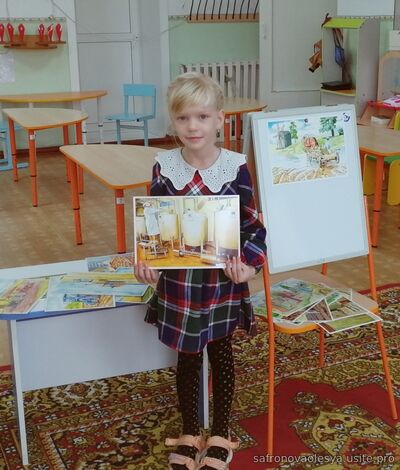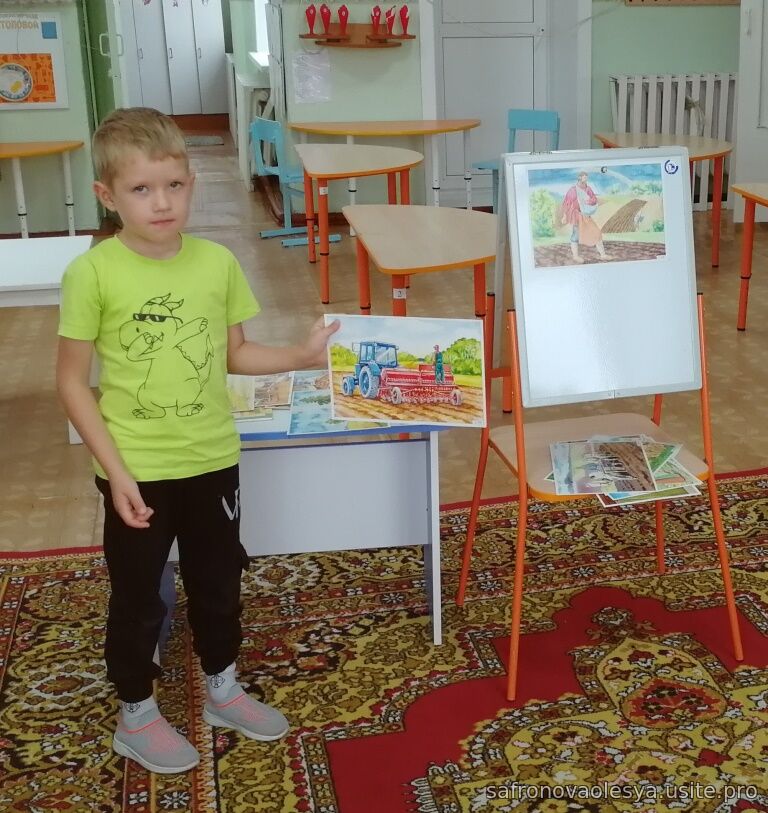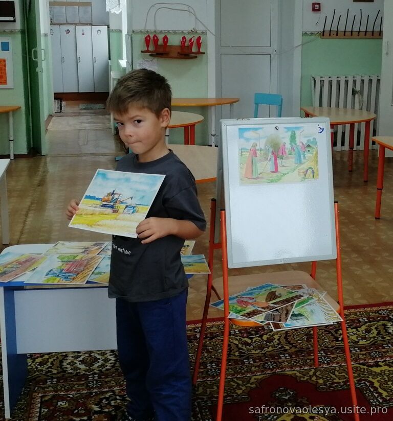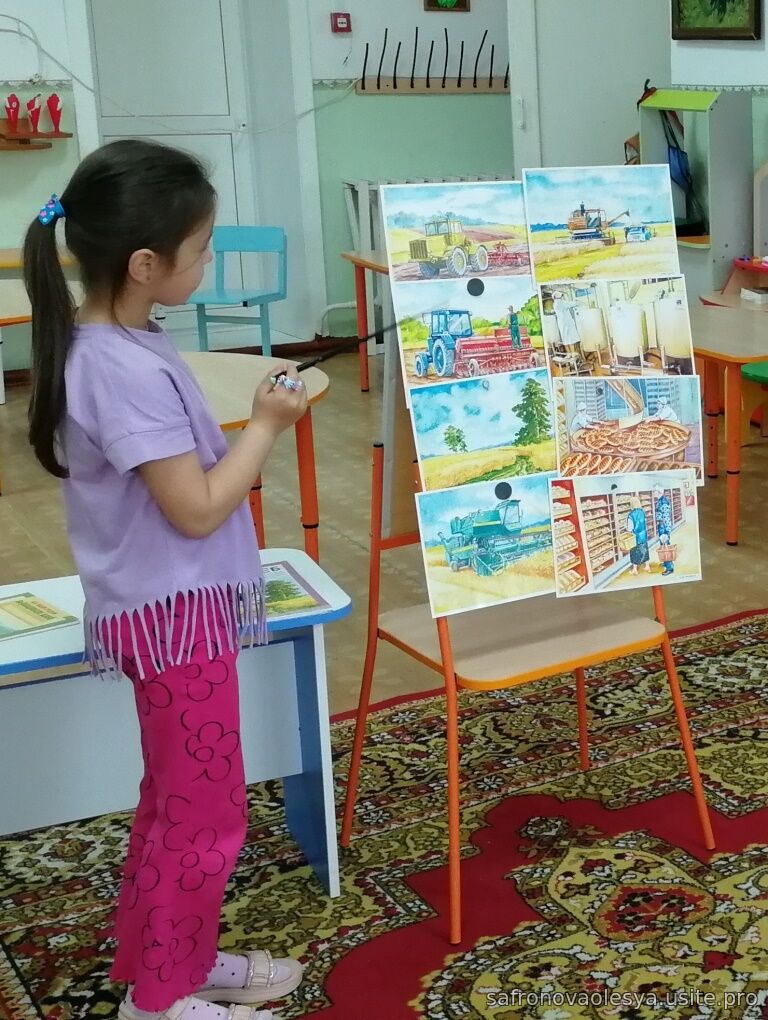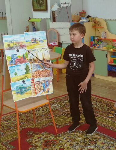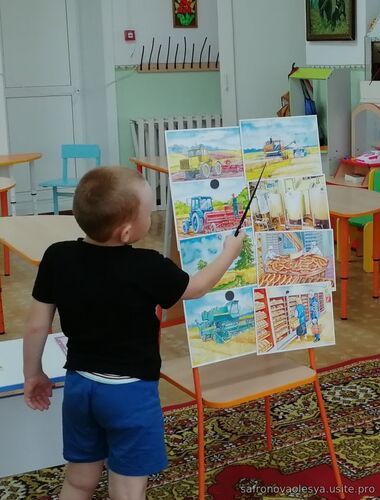 Внимание, внимание! Желающим совершить увлекательное путешествие в мир труда и знаний! Прошу всех желающих занять свои места и отправимся в путь. Ребята, отгадайте загадку: Бываю я черным, Бываю я белым, Румяным бываю И чуть подгорелым, иногда Да ведь это не беда! А кто знает из чего все это делают? Ответы детей. А что такое мука, из чего ее получают? Ответы детей. Из зёрен пшеницы получают пшеничную муку, а из зерен ржи – ржаную муку. Чтобы получить из зёрен муку, нужно затратить очень много труда: сначала вырастить рожь и пшеницу, потом собрать урожай. Этим занимаются хлеборобы. Ребята, вы хотите узнать, что же это за работа? Ответы детей. Выращивать и убирать людям хлеб помогают сильные машины. Весной, лишь только оттает и просохнет земля в поле выходит трактор. Кто ведет его? Ответы детей. Трактор тянет за собой железный плуг, который глубоко вспахивает землю. (Воспитатель читает отрывок из стихотворения Погореловского) Трактора выходят в степи Тянут плуги на прицепе Режут плуги, как ножом, Жирный сочный чернозем. Теперь можно начинать сеять! К трактору прикрепляют сеялки, и те равными, аккуратными рядами укладывают в почву зерна пшеницы. (Показ иллюстраций) Вот пшеница взошла. Все лето созревают зерна в колосьях. Поле в это время все зеленое, очень красивое. Солнце чертит в небе полосы, Птицы песни завели… Созревай же колос к колосу, Сладкий хлеб моей земли. - Хлебное поле ещё называю нивой. (Воспитатель читает отрывок из стихотворения Ю. Ждановской) Нива моя, нива, нива золотая! Зреешь ты на солнце, колос наливая; По тебе, по ветру, словно в синем море, Волны так и ходят, ходят на просторе…. Но вот зерна созрели. Начинается жатва. (Дети повторяют слово хором и индивидуально) И на поле выходят другие машины – комбайны. (Показ иллюстраций) Он идет волну сечет, из трубы зерно течет» - это загадка про комбайн. Кто работает на комбайне? (комбайнер – новое слово, повторить слово хором и индивидуально). Что же делает комбайн? Ответы детей. Комбайн – срезает колосья и вымолачивает из них зерна, эти зерна по специальному длинному рукаву высыпаются в грузовые машины, которые беспрерывно подъезжают по сигналу комбайнера. А из накопителя соломы комбайнера через определенные промежутки времени сходят большие желтые копны соломы.(Показ иллюстраций)